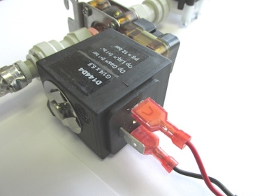 La prochaine étape est de faire le connecteur pour brancher le câble réseau aux valves. Vous aurez besoin d’un bout de câble de cuivre toronné de calibre 18AWG, de deux terminaux 6.35 millimètres (0.25 pouce) et de 2 scotchlocks. Enlevez la gaine à chaque extrémité du câble. A l’une des extrémités, dénudez les 2 brins sur environ 1 centimètre (0.5 pouce), insérez chaque brin dénudé dans le baril (partie étroite du terminal) de chaque terminal sur environ 1 centimètre (0.5 pouce)et à l’aide de pinces à sertir, pressez fortement le baril pour attacher les terminaux aux brins.