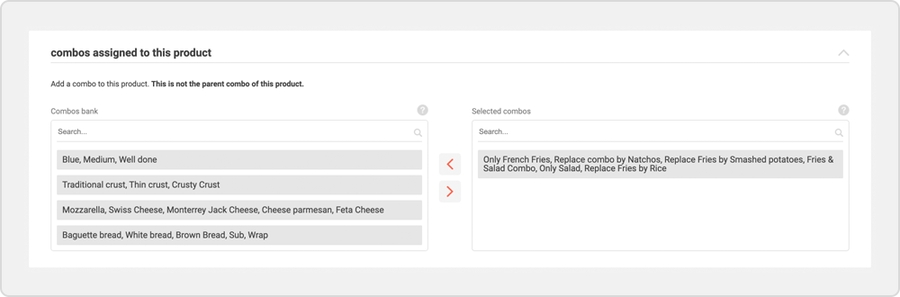You can assign one or more combos to a choice product. Thus, when a user chooses a choice product during an order, they will have access to the combos linked to this choice product.